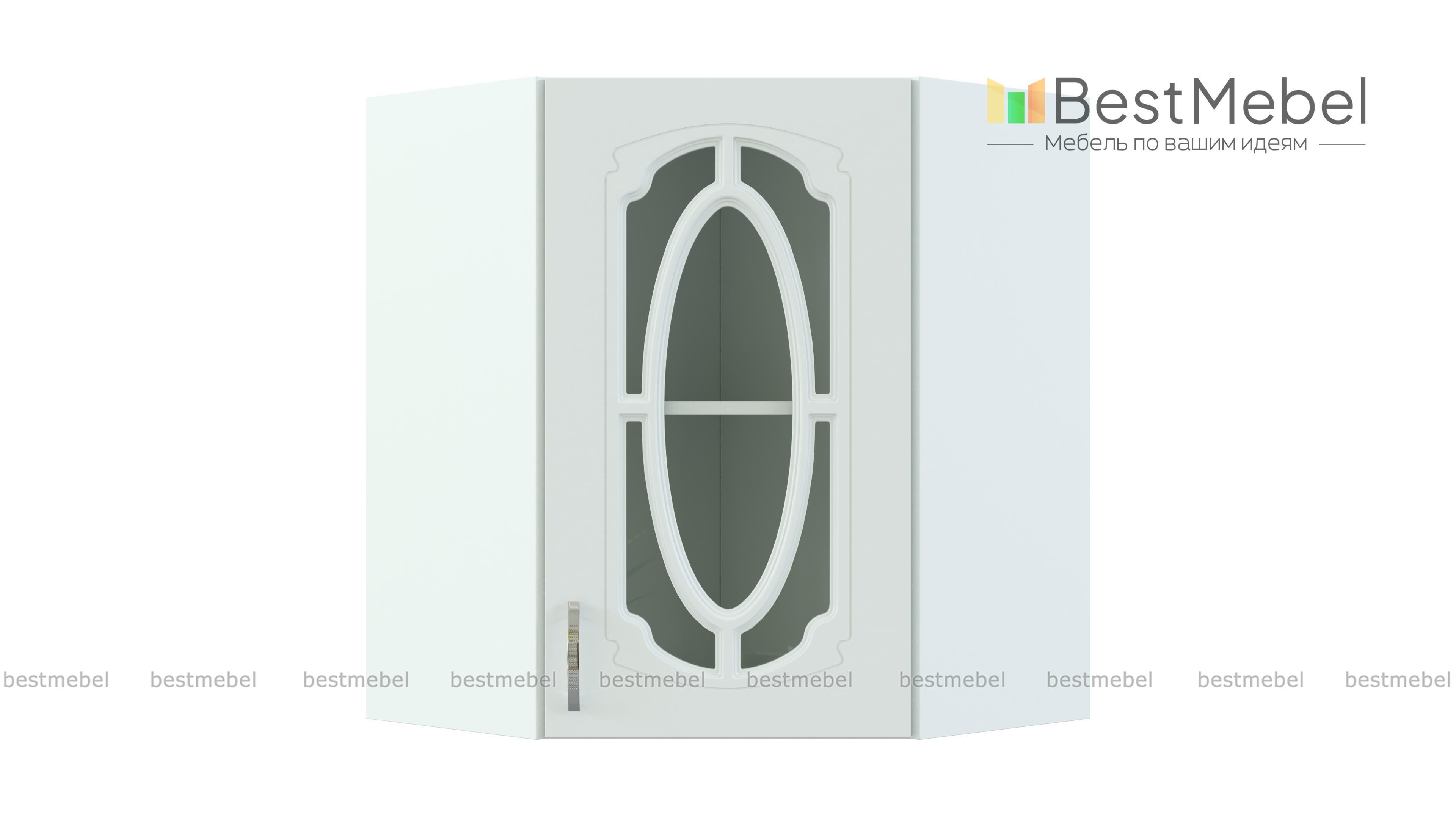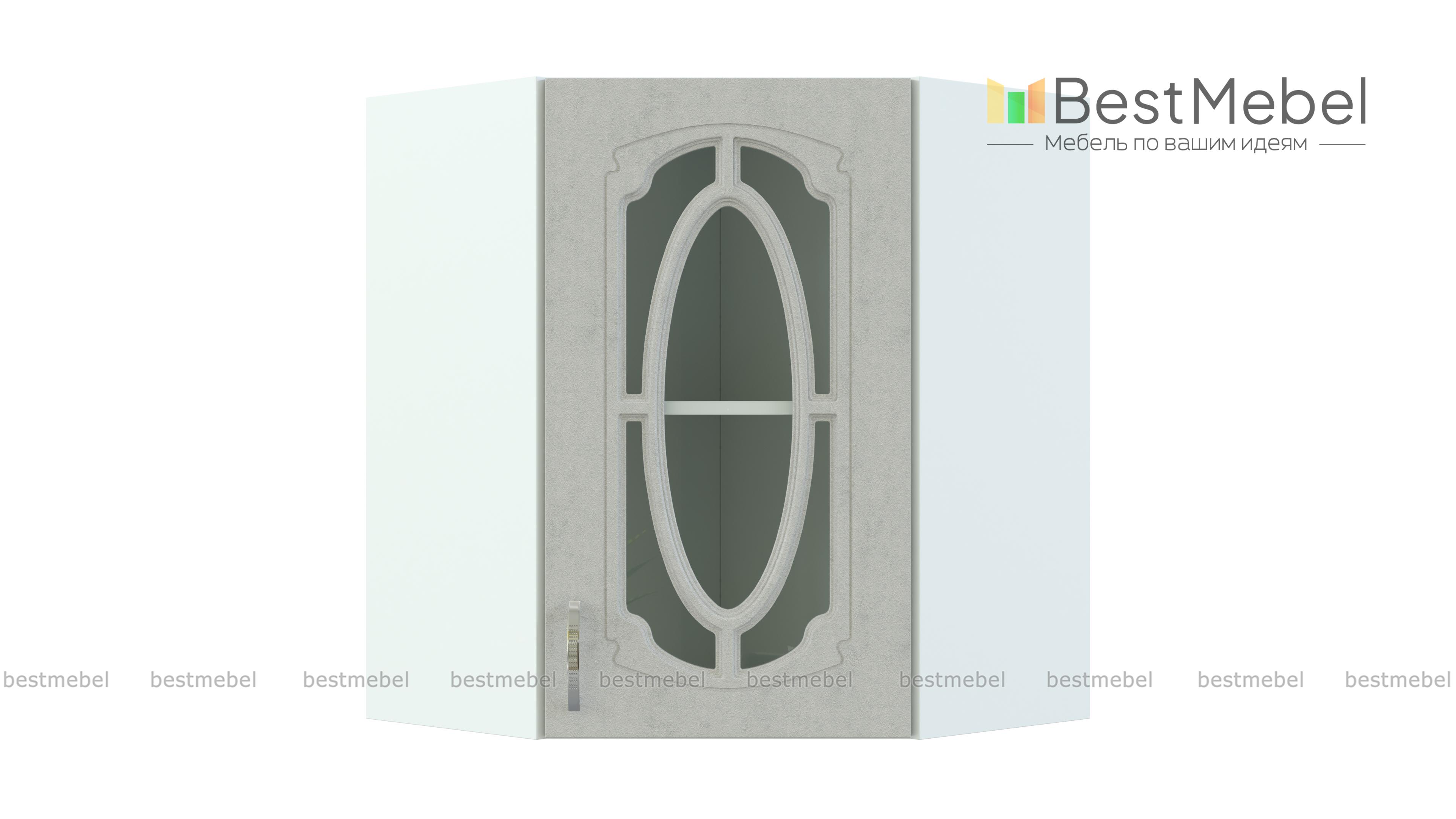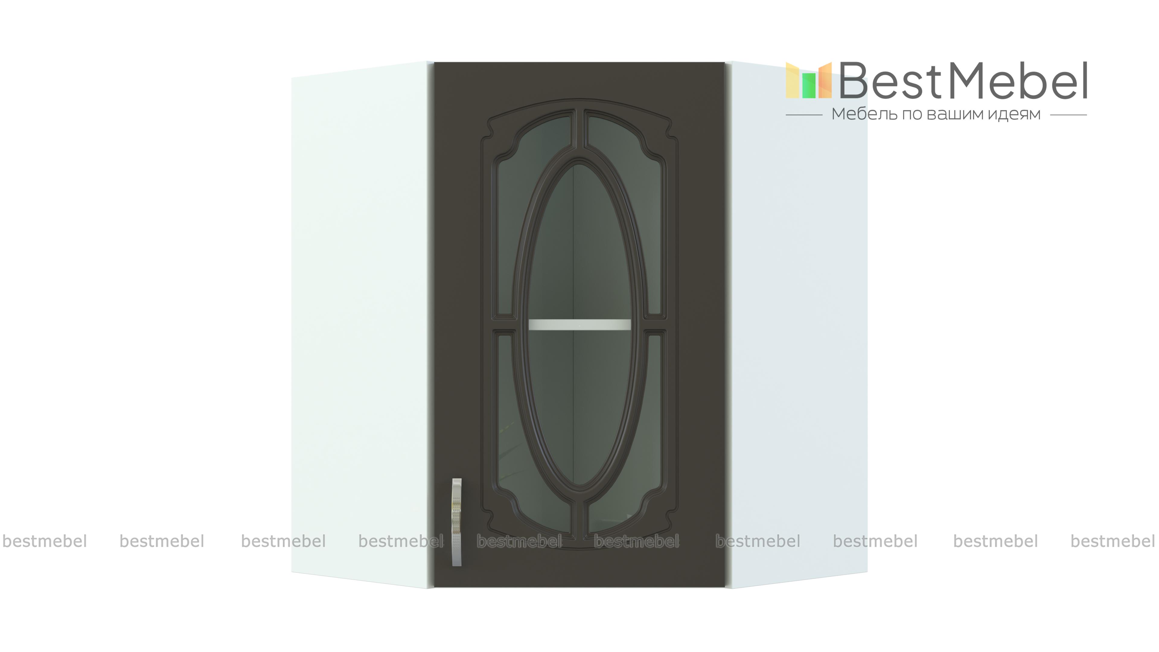 Шкаф верхний угловой остекленный Настя BMS – многофункциональная модель, которая совмещает функции стыковочного элемента и витрины. Шкаф позволяет присоединять модули любой конструкции и отличается вместительностью при компактных размерах. Внутреннее отделение с полкой позволит выгодно разместить посуду, предметы декора, хрупкие вещи, а эффектный декор фасада станет украшением домашнего интерьера. Купить шкаф верхний угловой остекленный Настя BMS вы сможете по лучшей цене в нашем интернет-магазине.