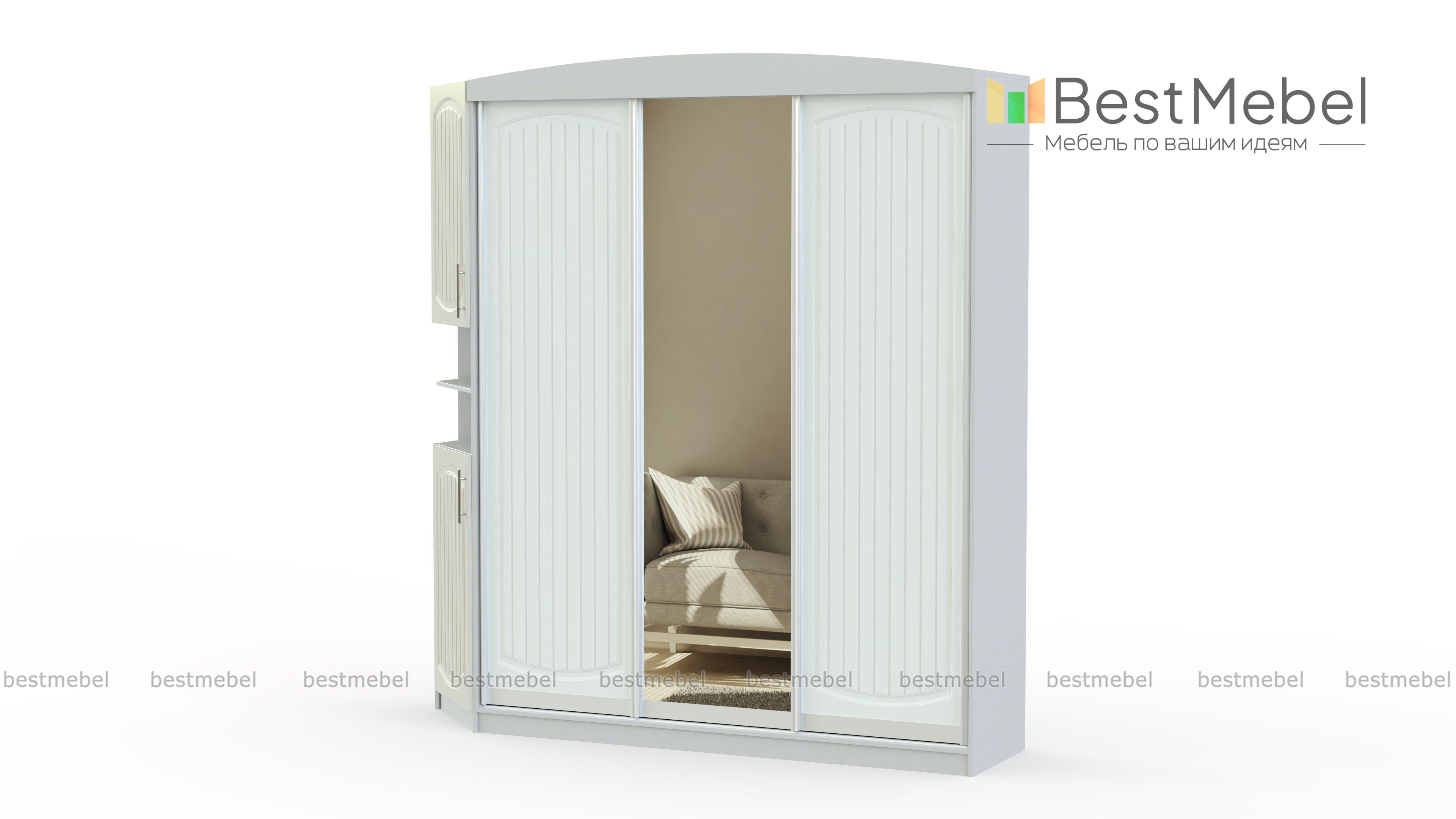 Шкаф-купе ЭТ-6 BMS выполнен в классическом стиле, сочетая нейтральную палитру с фрезерованным декором. Трехдверная модель с отделениями для хранения белья и одежды дополнена скошенной секцией, позволяющей разместить всевозможные мелочи и аксессуары. Раздвижная конструкция створок значительно экономит пространство, а зеркало на фасаде зрительно расширяет границы помещения. Купить шкаф-купе ЭТ-6 BMS с выбором фурнитуры и цвета по каталогу вы сможете в нашем интернет-магазине.