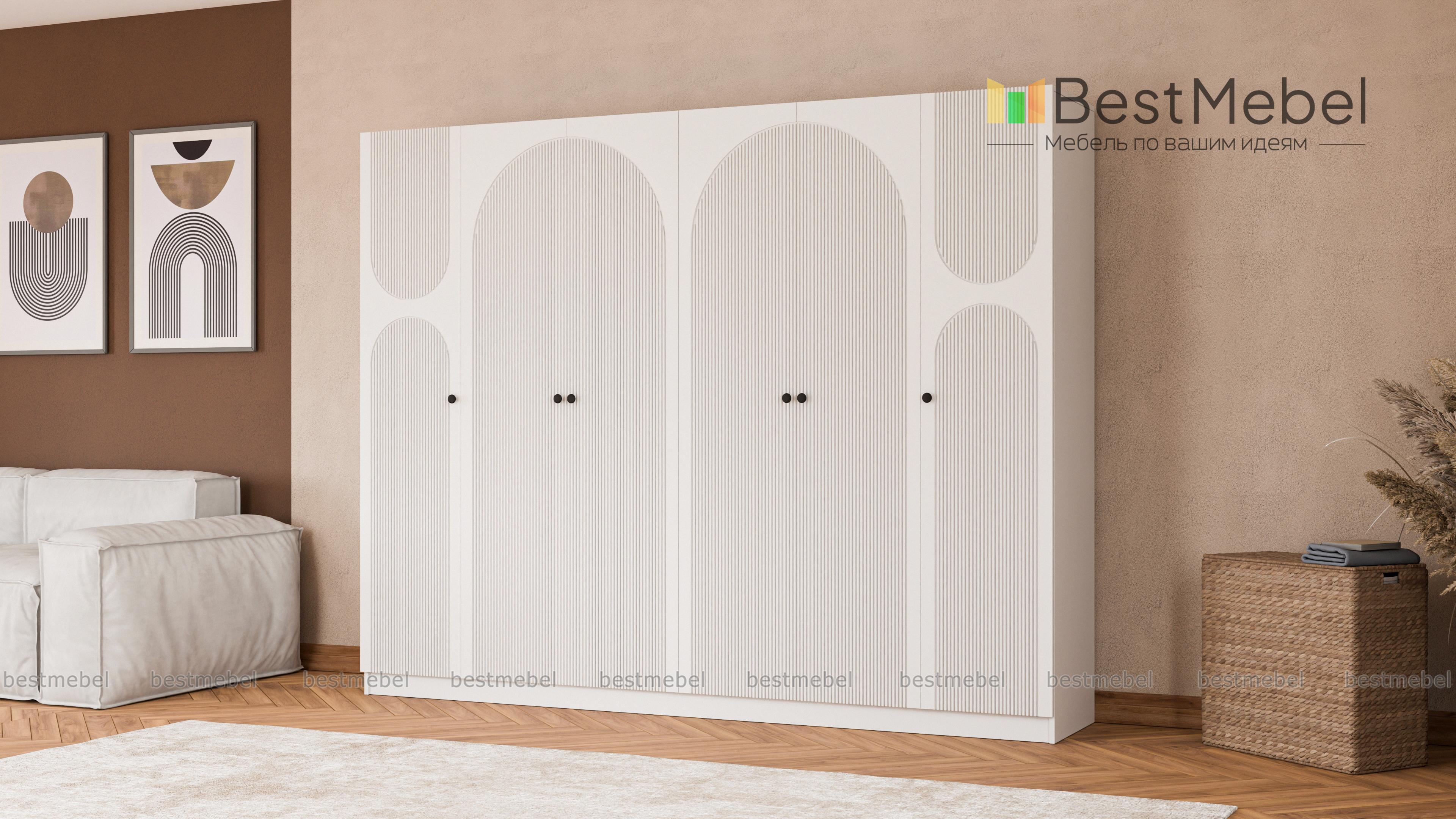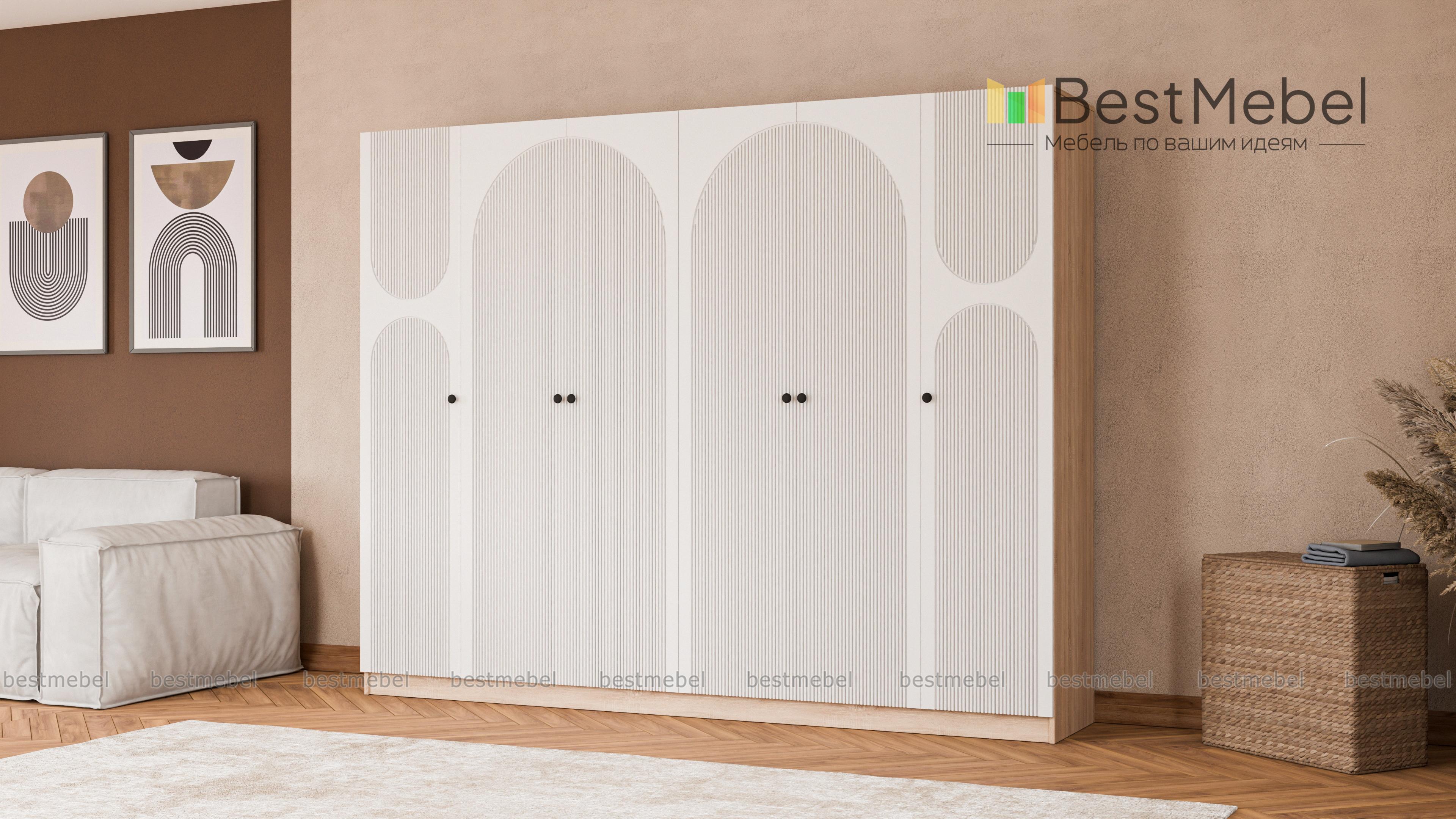 Шкаф распашной Вивьен 17 BMS оборудован двухдверными секциями в центре и однодверными — по бокам. Благодаря распашной конструкции створок вы сразу видите содержимое полок и штанг. Для корпуса габаритного шестидверного шкафа использована прочная ламинированная плита с древесной фактурой, эффектный темный фасад украшает оригинальный рельеф. Купить шкаф распашной Вивьен 17 BMS вы сможете в нашем интернет-магазине, подобрав размеры, ручки, оттенки корпуса и фасада.