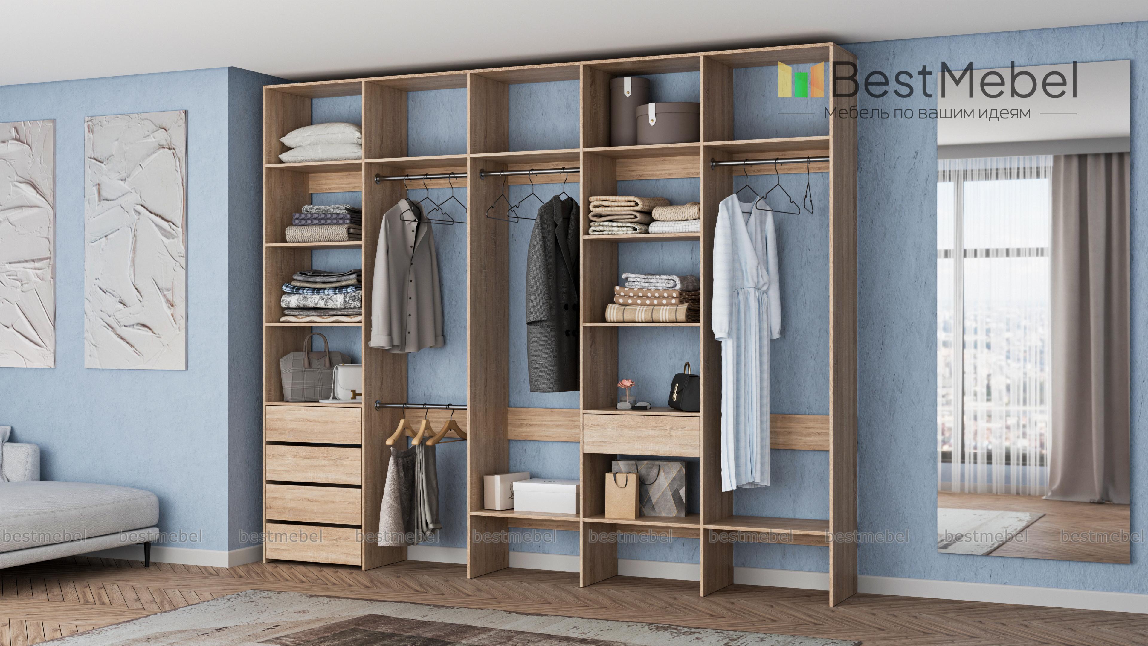 Стеллаж для одежды Мирта 73 BMS удобно зонирует пространство для хранения. Четыре штанги и полки позволят рассортировать одежду по категориям, расположенные на нижнем уровне полки удобны для создания обувниц, а в ящики можно убрать аксессуары, белье и другие мелочи. Дизайн стеллажа лаконичен и универсален, а поверхности из ламинированной ДСП устойчивы к влаге и появлению царапин. Купить стеллаж для одежды Мирта 73 BMS, изготовленный по вашим размерам, вы сможете в нашем интернет-магазине.