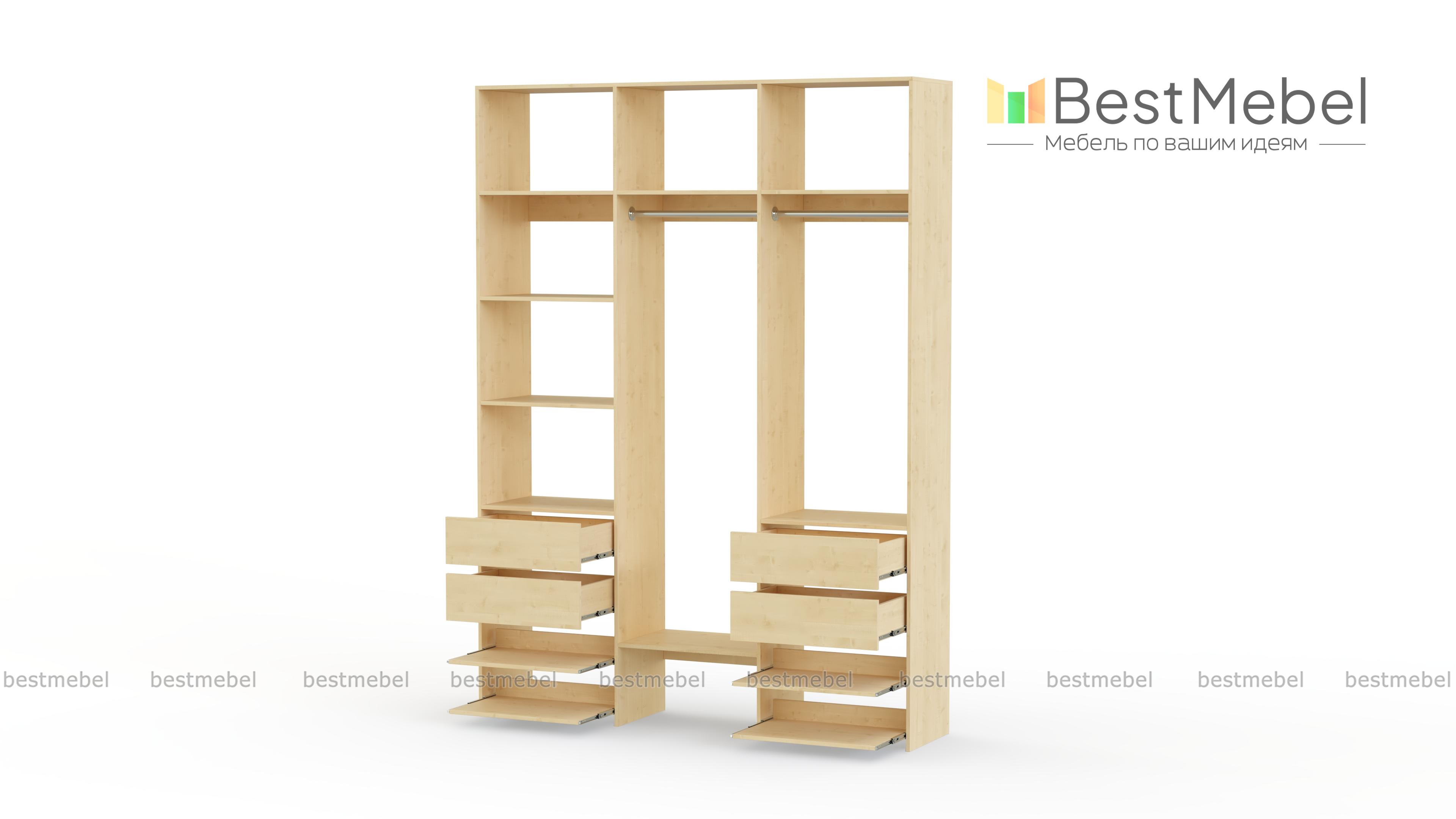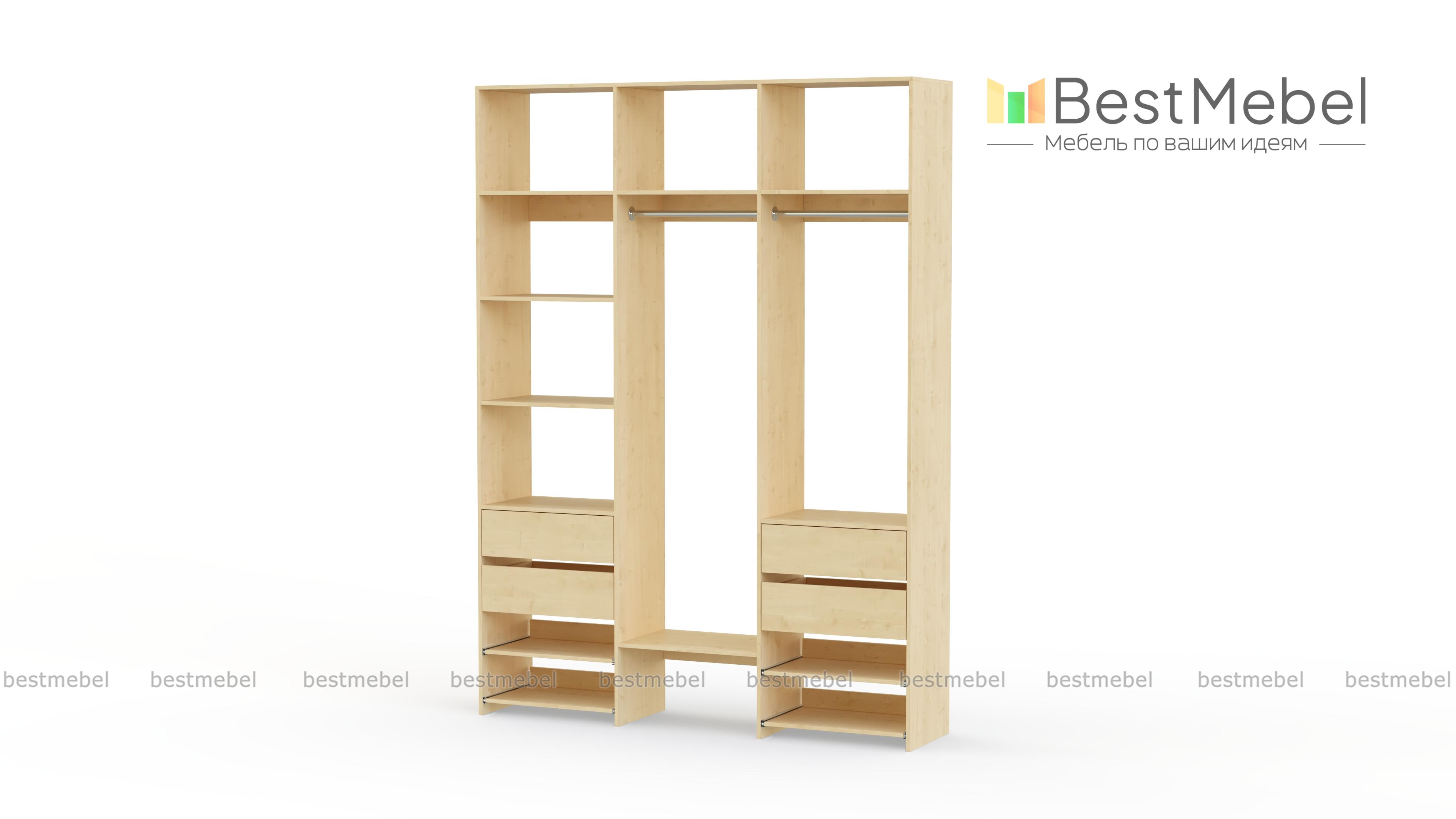 Стеллаж для одежды Мирта 90 BMS станет вашим помощником в сохранении порядка. Компоновка, включающая две штанги, боковые и верхние полки, две пары ящиков и выдвижных панелей, оптимальна для аккуратного размещения одежды на вешалках и в сложенном виде, обуви и мелких аксессуаров. Нейтральный древесный оттенок ламинированной плиты подчеркивает универсальность дизайна. Купить стеллаж для одежды Мирта 90 BMS в прихожую, гардеробную, мастерскую приглашаем в наш интернет-магазин.