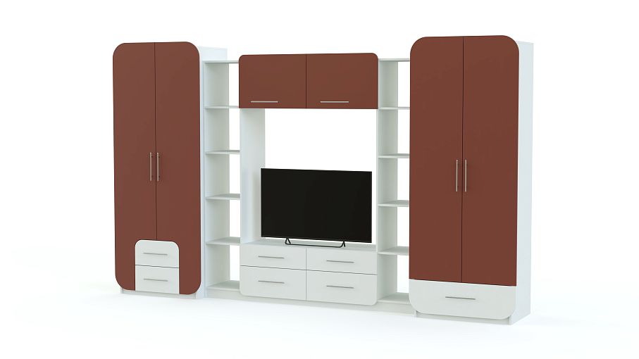 Необычное стилевое решение стенки Пенелопа-9 BMS сразу привлекает внимание. Эффектная и вместительная, она станет идеальным решением для гостиной или студии. Модель оборудована платяным и бельевым шкафами, стеллажами с открытыми полками, тумбой под ТВ с выдвижными ящиками и навесной верхней секцией. Скругленные углы шкафов и центральной композиции придают стенке завершенный вид, а яркие матовые фасады поднимут настроение хозяевам и гостям дома.