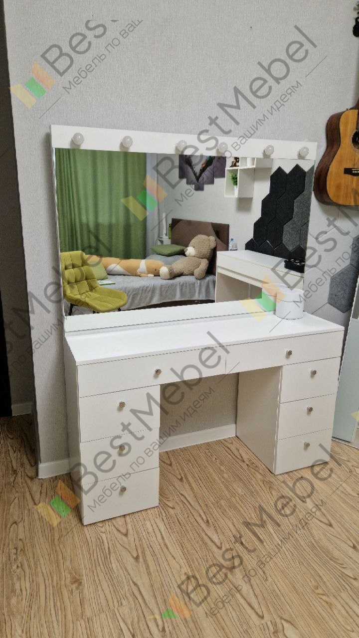 Туалетный столик Лацио 5 BMS выполнен в белоснежном глянце и отличается эффектным минимализмом. Практичная современная модель обеспечит комфортный уход за собой и разместит в зоне быстрого доступа все необходимые мелочи. Оптимальный для нанесения макияжа, столик оборудован широкой столешницей, под которой располагаются выдвижные ящики разных размеров, и большим зеркалом с лампочками. Купить туалетный столик Лацио 5 BMS вы сможете в нашем интернет-магазине по лучшей цене.