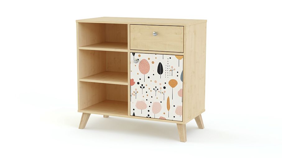 Тумба Эльза 4 BMS с высокими ножками в стиле сканди имеет простую удобную конструкцию, которой ребенку будет комфортно пользоваться. Слева располагаются полки для открытого хранения, а справа выдвижной ящичек для мелких предметов и распашная секция. На дверцу и ящик тумбы установлены эргономичные круглые ручки, распашной фасад украшает симпатичный нейтральный принт. Купить тумбу Эльза 4 BMS, вы сможете в нашем интернет-магазине, подобрав размеры, цвет и фурнитуру.