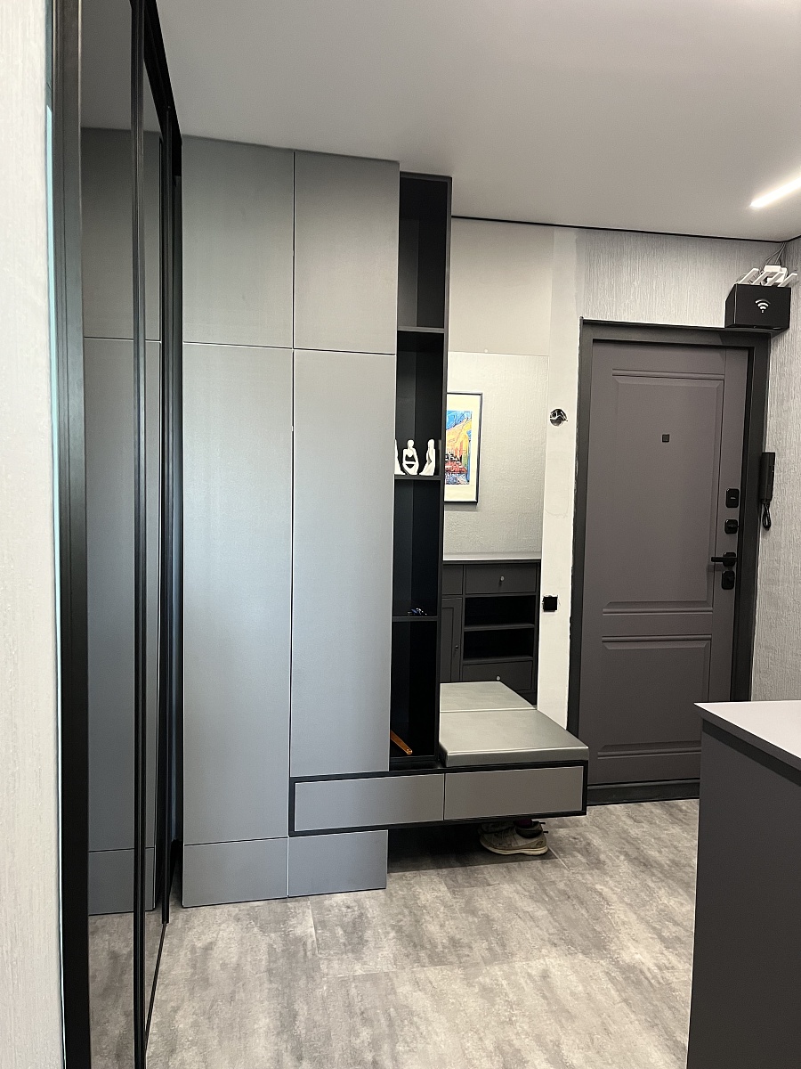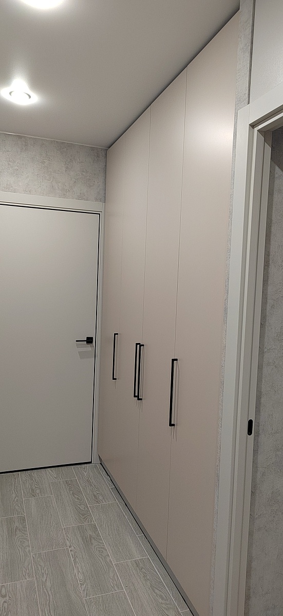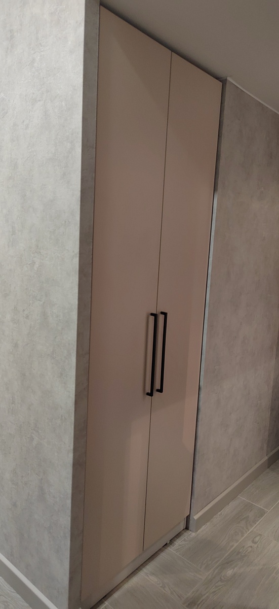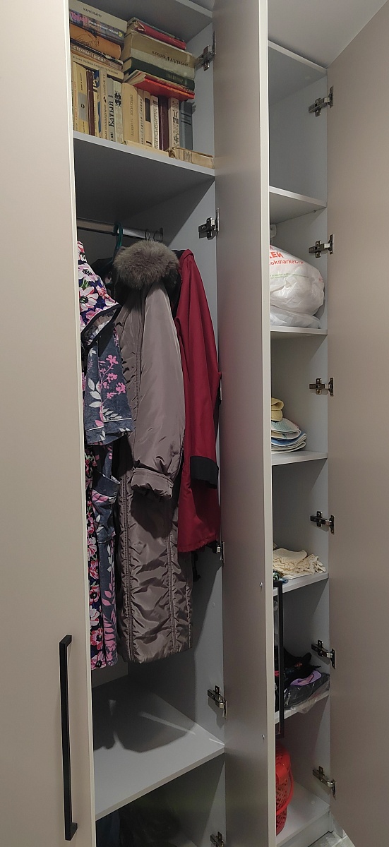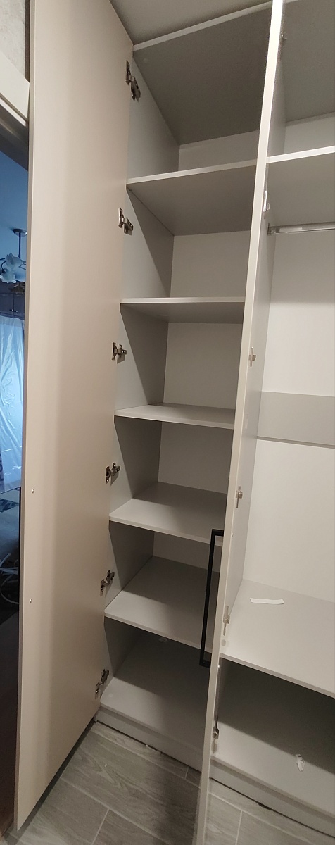 Шкаф распашной Остин Лайт 23 BMS (700х2050х440), заказ 00000204767. Делали ремонт в коридоре и необходимо было заменить два шкафа, прихожую и дверцы на антресолях. Всё заказали здесь. Заказывали оба шкафа Остин через сайт (Лайт 3 BMS и этот Лайт 23 BMS). Самостоятельно поменяли размеры, цвет фасадов (Тэффи L) и цвет самого шкафа (серый), кромку лицевых частей на 2 мм, ручки оставили эти (понравились), петли поменяли на Блюмовские с доводчиками. Внутри поменяли штангу на полки (6 шт), сделали перфорацию, чтобы в процессе эксплуатации можно было переставлять полки на нужную высоту. После оформления заказа на сайте, перезвонила менеджер (минут через 20), еще раз всё уточнила и перепроверила, помогла с точными размерами, чтобы шкаф точно встал в нишу. Всё изготовили быстро. Позвонили и согласовали день доставки. Доставка хорошая, оформляли с поднятием в квартиру. Комплектация полная, всё целое. Выдали документы с гарантией и телефоном компании по сборке. Позвонили туда и через час с нами связался сборщик, согласовали уже с ним дату и время. Отличный парень по сборке мебели. Собрал нам сразу два шкафа и прихожую за 4 часа. Спасибо, что появился такой интернет-магазин! Цена шкафа намного ниже, чем заказывать в компаниях по изготовлению мебели на заказ (узнавали в 5 компаниях) и сроки изготовления в несколько раз быстрее. Спасибо, что появился такой интернет-магазин!