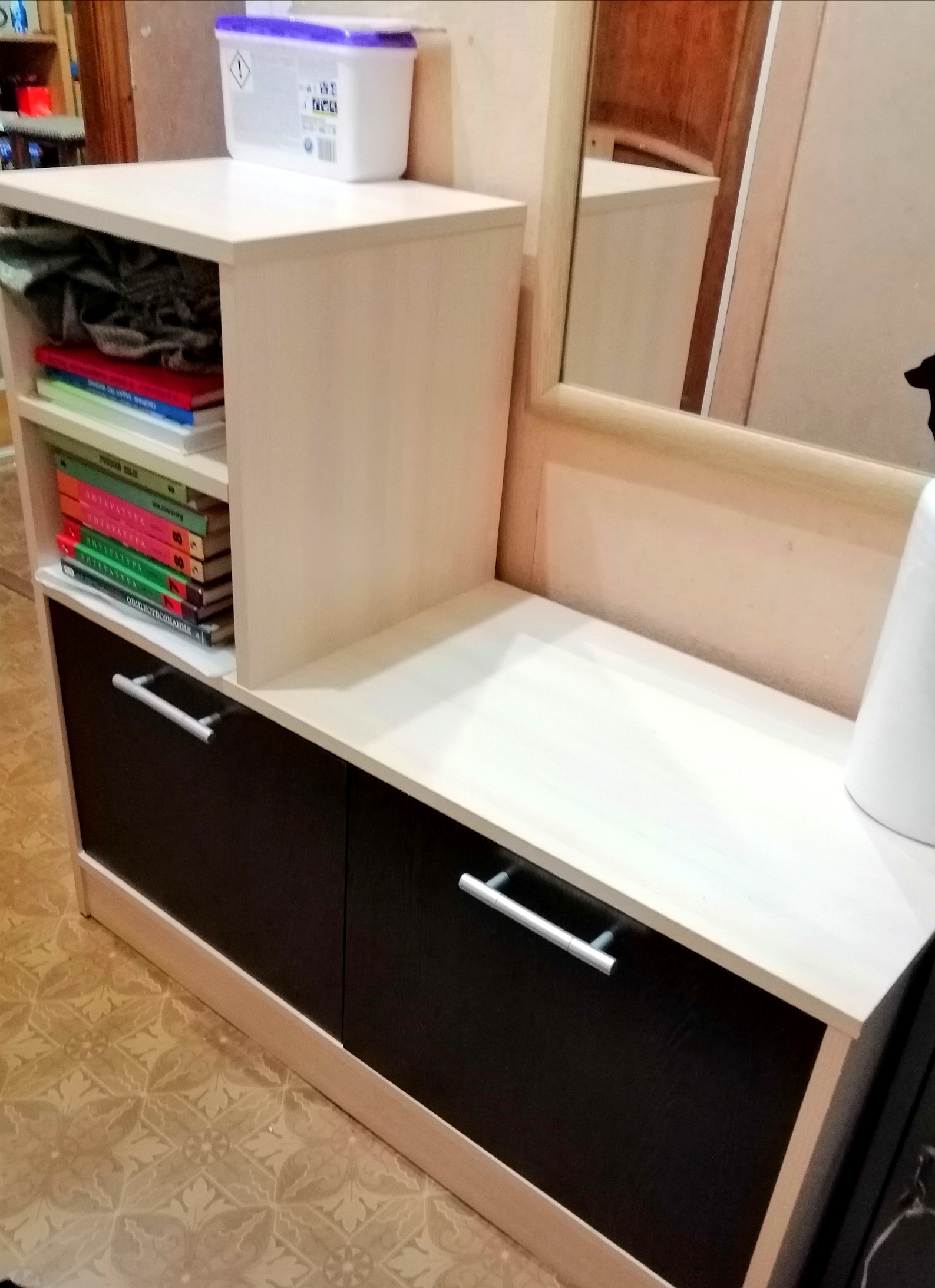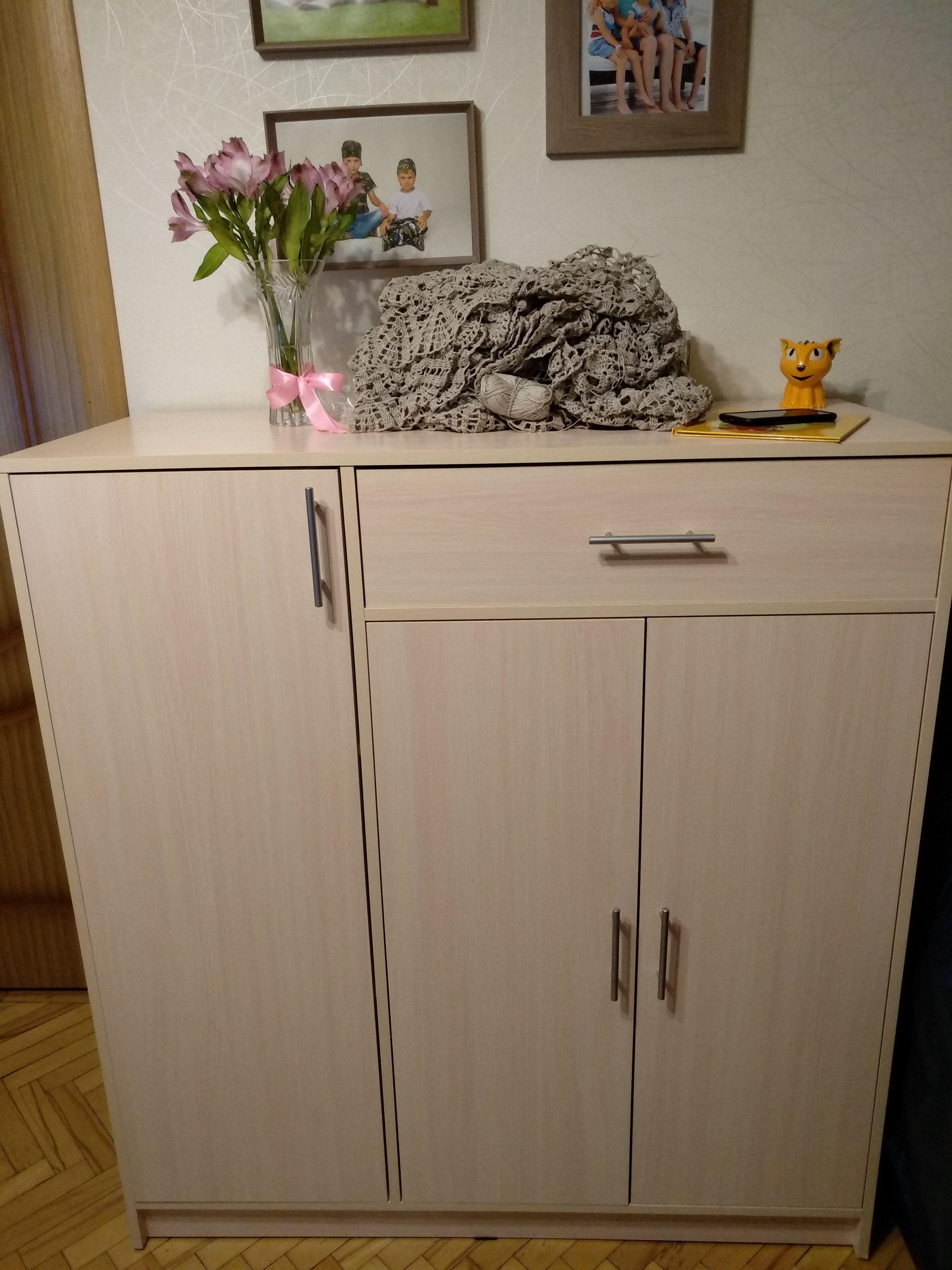 Покупала тумбу в прихожую вместе с вешалкой для одежды. Собирая чуть-чуть расстроились т.к. некоторые отверстия не совпадали, поэтому углы чуть кривые. Но если углы получилось исправить, то цвет торца, который выбивается из общей картины, не исправить ( на фото видно).  Хотела писать в магазин, но понятно что качество соответствует цене, да и одну деталь конечно не привезут на замену.  В целом все очень даже получилось симпатично. Мне нравится, а на цвет торца уже не обращаю внимания.