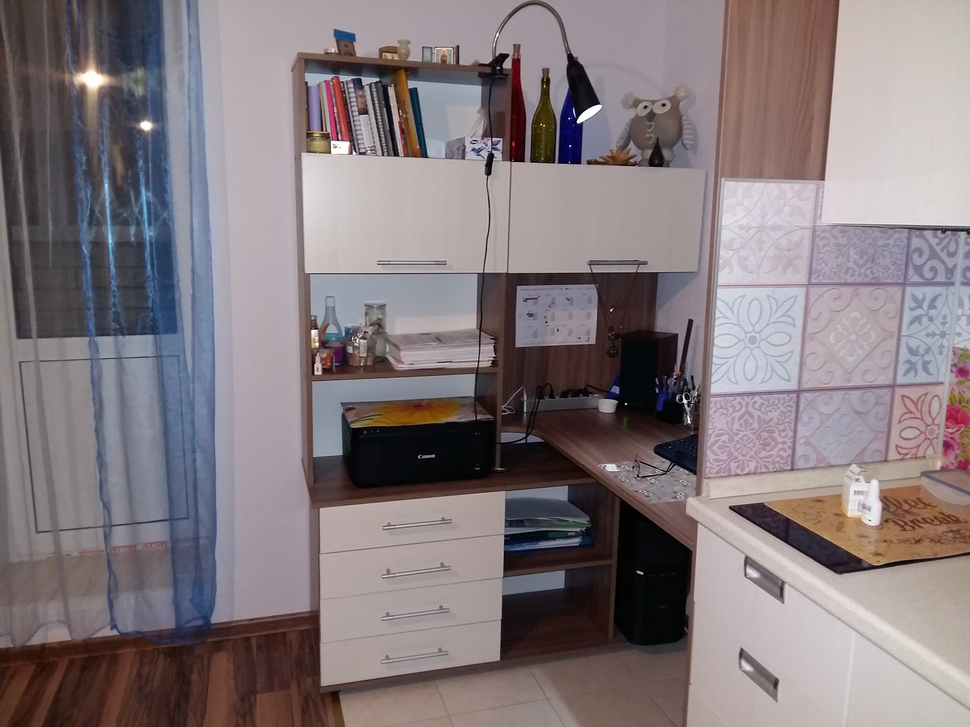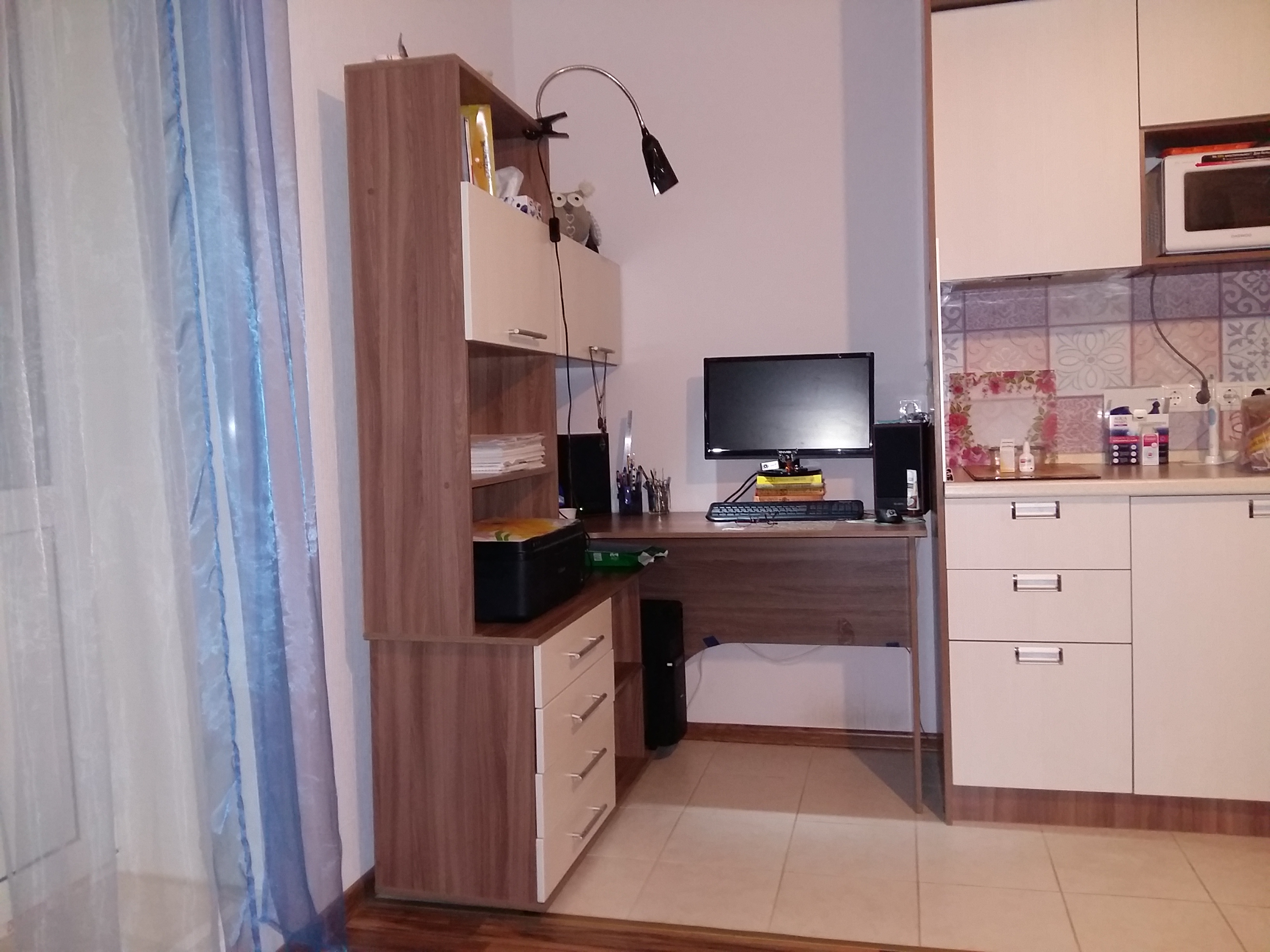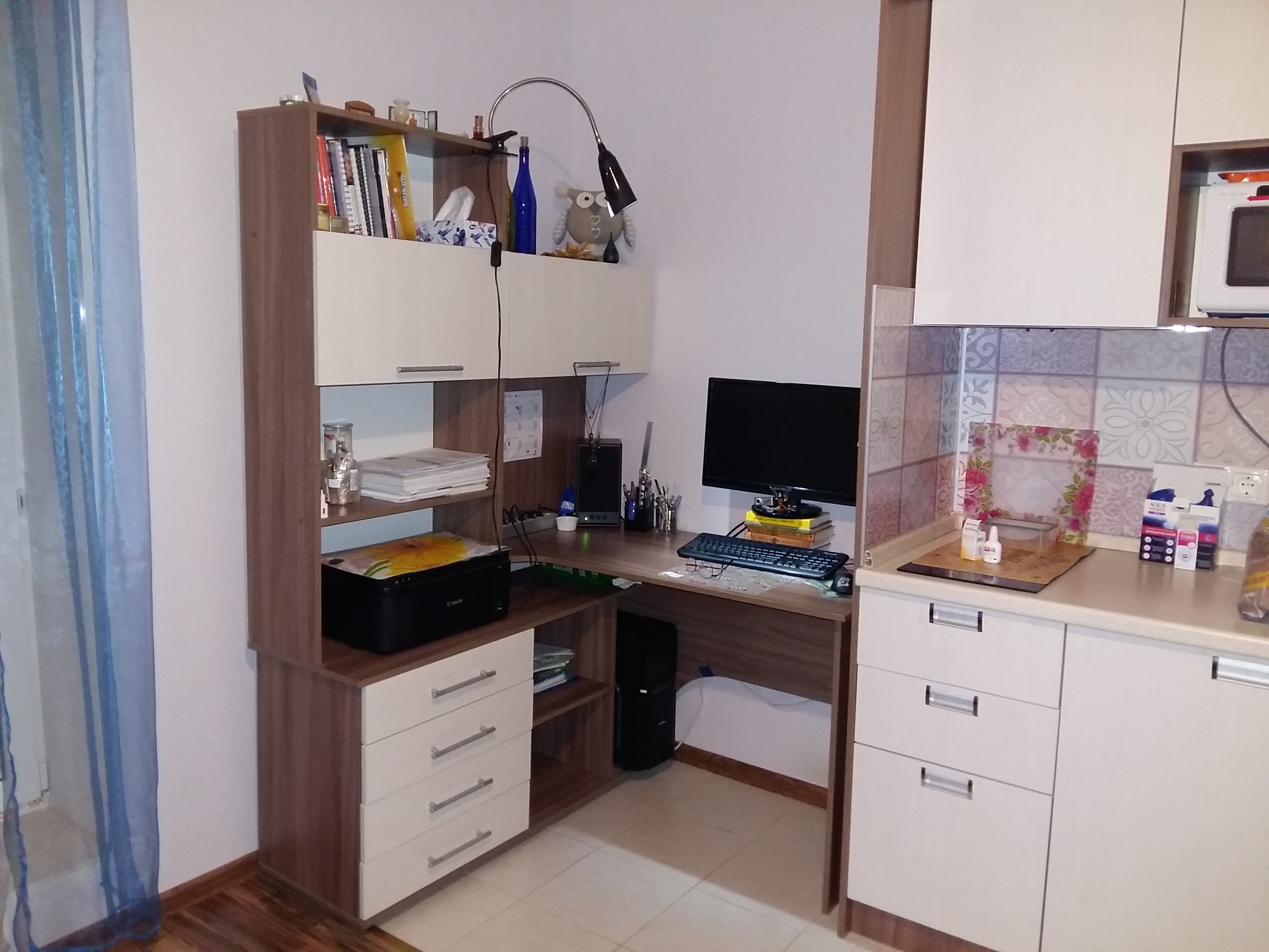 Очень долго подбирала стол, т.к. это главное для меня рабочее место, тем более надо было все продумать, поскольку у меня маленькая квартира-студия. По эргономичности все отлично, достаточно полочек и ящичков, где можно хранить все документы, даже принтер хорошо вписался. Минус только что системный блок немного выпирает, хоть я и мерила все по сто раз... и столешница если бы была поглубже было бы удобнее, но это скорее уже мои личные пожелания, в целом отличный стол. Особенно порадовала возможность выбора цвета, и так уж совпало, чисто случайно, цвета подбирала на глаз, чтобы хоть немного сочеталось с кухней что стоит рядом, в итоге, как видно на фото, цвет один в одни) Хотя производители разные и даже названия этих цветов разное.